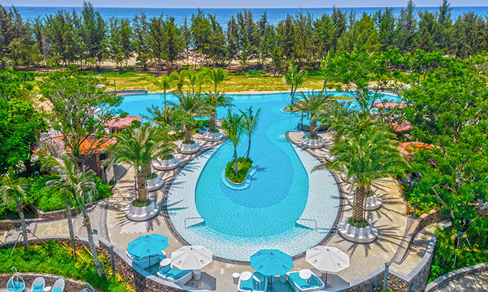 户外主泳池占地1500平方米,清新马卡色系蓝在海风的抚动下泛起阵阵涟漪。如绿洲般的浮岛点缀其中,倒映斑驳树影。可近距离观海,畅游其中,感受水流的力量。